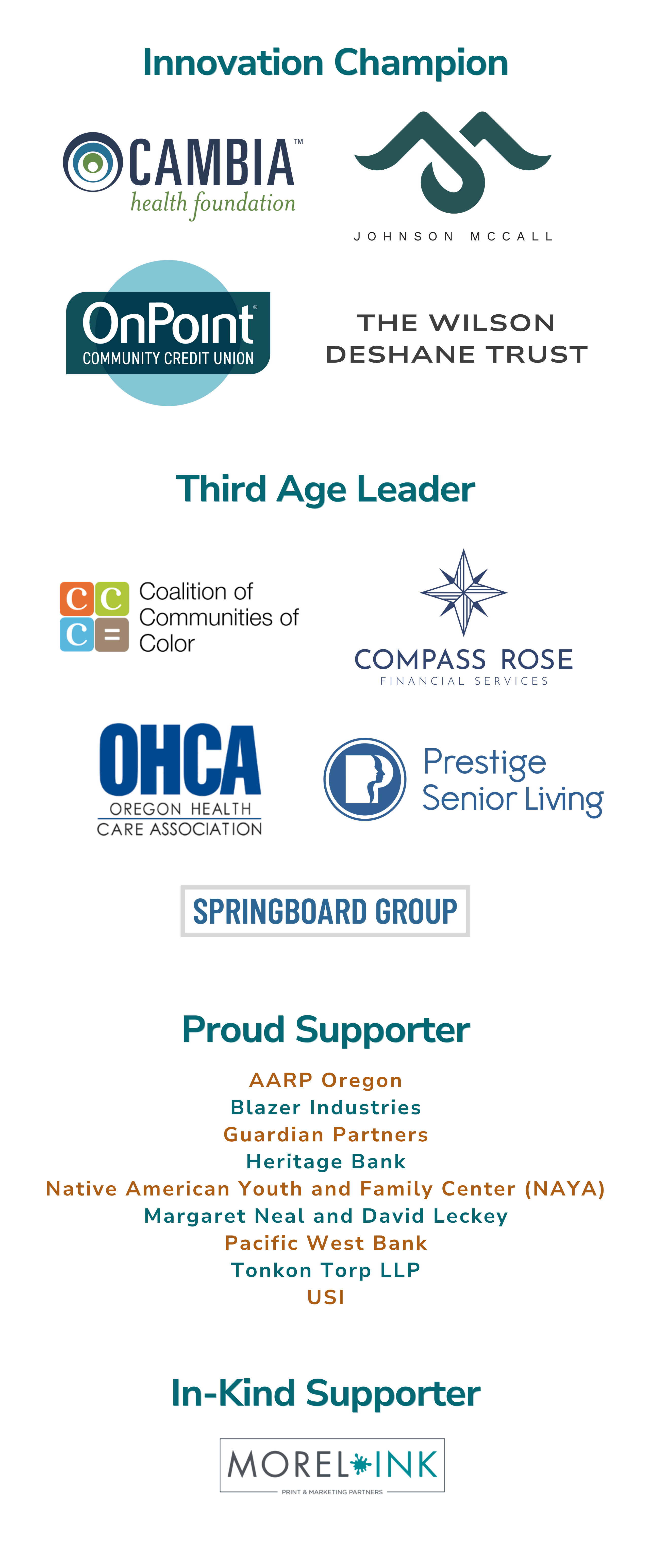 Mark your calendars for an unforgettable celebration on April 15, 2026 at 11:30am PT. Join us in-person at AVENUE Portland or virtually as we honor Judy Knawls Boyer, Tony Leineweber, and Jo Anne Sutherland—incredible Oregonians who are strengthening their communities and showing that aging is living!